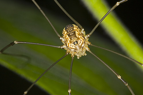 Harvestmen are distinguished from spiders in having a one-piece body with the cephalothorax and abdomen fused. The abdomen in harvestmen is also noticably segmented. Almost all species have extremely long, spindly legs, which have earned them the other common name of "Daddy-longlegs" in some areas, such as North America.