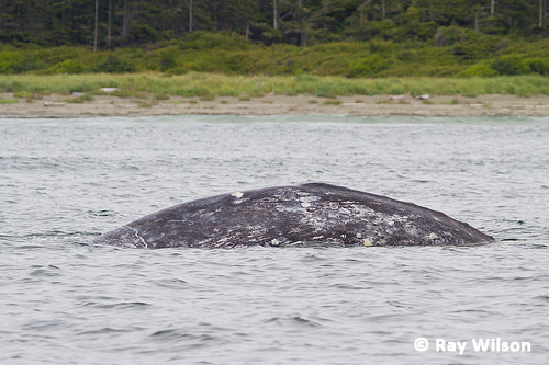 Grey Whales are bottom feeders, filtering mouthfuls of sand through their baleen plates to retain the edible morsels such as shellfish and crabs. In places, the coast around Tofino is very shallow and the whale we came across was feeding in water that was only 9m deep. Consequently, it was only making shallow dives and didn't once raise its flukes out of the water and it was the least impressive encounter I have had with any of the great whales I have seen.