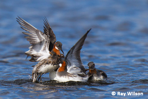 Red-necked Phalaropes are unusual shorebirds in many aspects. Most shorebirds are quite adverse to swimming and feed by wading in the water, Phalaropes, on the other hand, spend most of their time swimming, rapidly twisting and spinning as they feed on plankton and small insects that occur near the surface of the water.