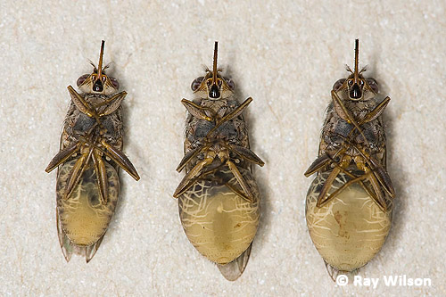 All of the Tsetse Flies in these photos were live, uninfected, laboratory reared individuals and photographed under controlled conditions. The comparison photos showing the undersides of the flies were taken in a cold room (4-8°C) to render the flies inactive.
