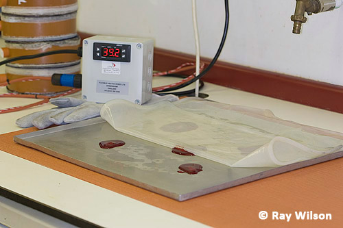 In the laboratory, routine feeding of the tsetse flies takes place through a silicon membrane. The apparatus used is shown above, and comprises of: a heating mat which is thermostatically controlled to keep the blood at body temperature; a metal tray onto which small quantities of blood are placed; and a silicon membrane which simulates skin for the flies to pierce.